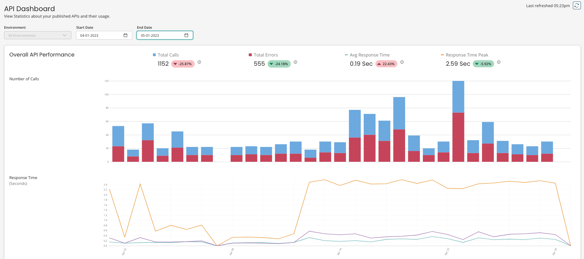 Total calls, total errors, average response time, and response time peak figures are presented with a percentage that compares to the previous time period. If you are viewing seven days of data, the previous period would be the preceding seven days.