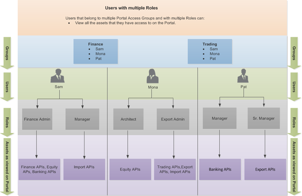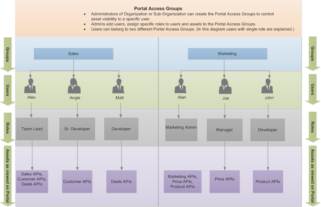 The following diagram shows how each user can view the assets on the Portal based on the role assigned.