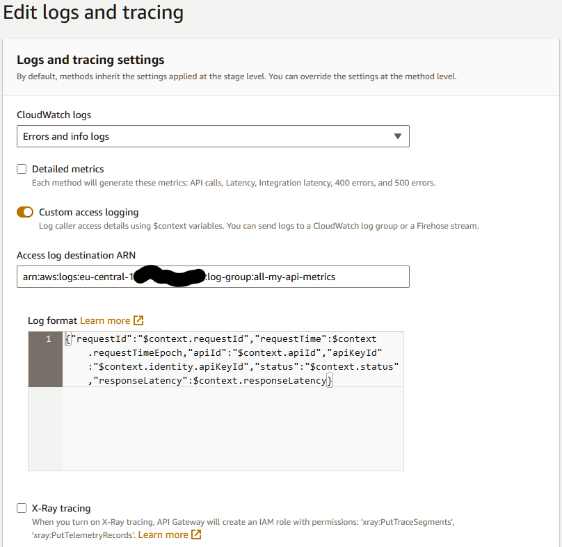 First, you should read this article on Set up CloudWatch logging for REST APIs in API Gateway - Amazon API Gateway. There are two types of CloudWatch logging - we care about access logging, not execution logging.