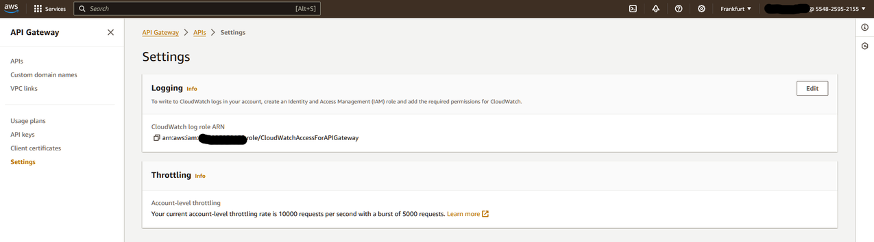 Next, in AWS API gateway, go to settings and under logging, select the role you just created.
