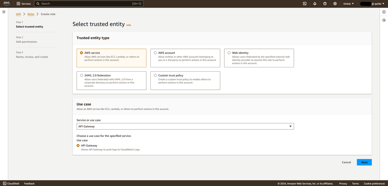 The first step (if you haven’t already done so) is to create a new IAM role and configure it in the API gateway settings. Go to IAM -> Roles and create a new role. In the first step, select AWS service as trusted entity type and select the API Gateway use case. Proceed through the remaining steps with default settings.