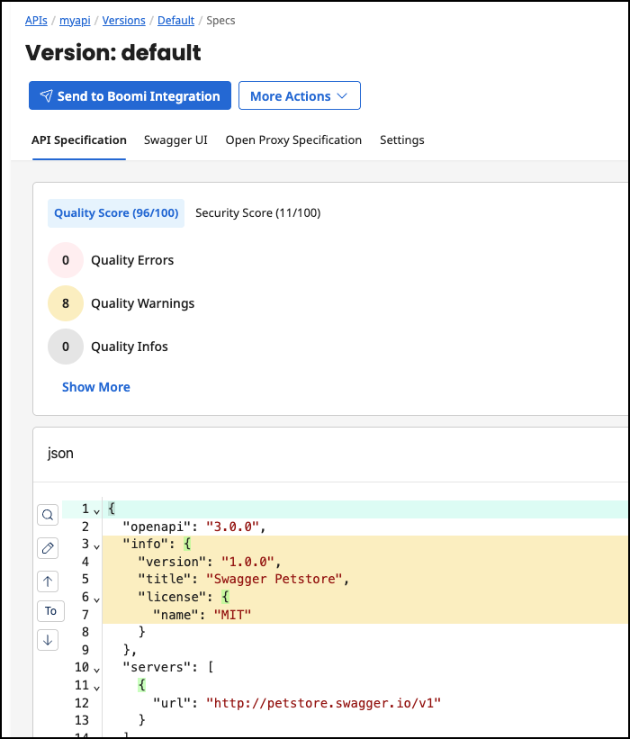 Select the API from the APIs list and select Versions. Click the API version that you want to send to Boomi Integration.