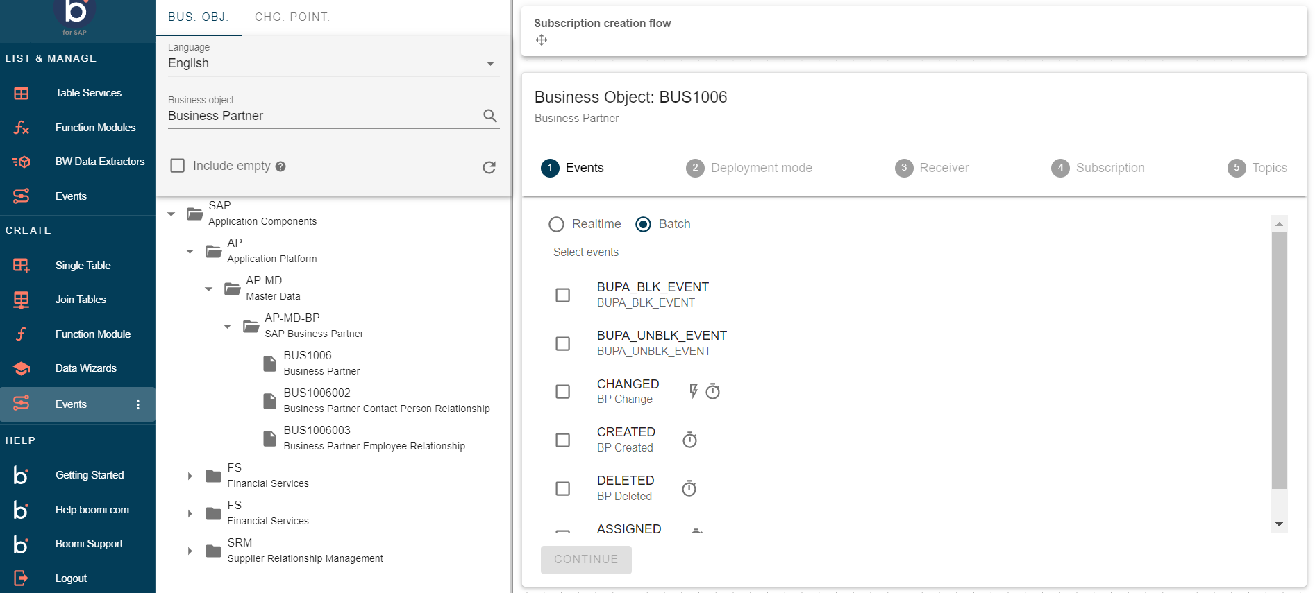 Adding Event Filters: You can add event filters that uses metadata from the event itself to determine if the event should be handled. These filters can examine the table key(s) in change pointer events or the fields from a business object event. Learn more about how Boomi for SAP manages Buisness Object Event and Payload Filtering.