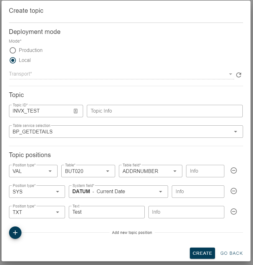 When creating a new Topic, you can choose an ID of your choice and provide a description. You can choose between a static text or assign a system for the Event Only and Event - metadata topic positions.