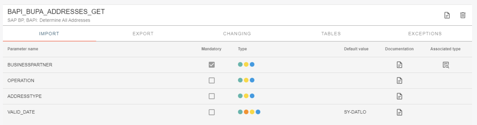 Exceptions Exceptions indicate which errors the modules have specified as possible errors. Take the possible exceptions into account when developing Boomi processes. The exceptions can be class-based. The figure below shows an example of a Function Module that does not contain exception classes but includes two expected errors when calling the function.