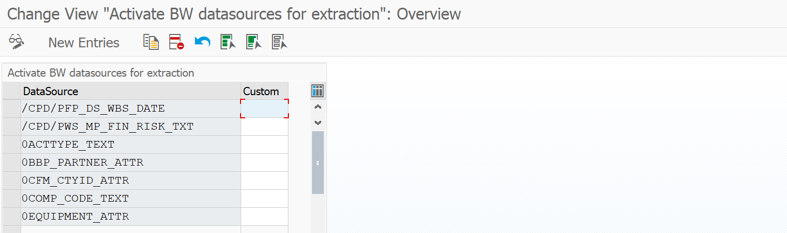 - Select the desired data source and add 'X' to the Custom column if you want to handle the extraction through a custom BADI implementation, not the standard Boomi for SAP implementation.