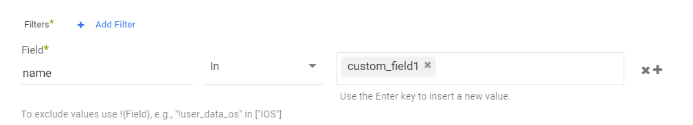 - You can use the exclamation mark to designate a not in your filter. For example, the following snapshot instructs the API to return all user data operating systems except iOS.