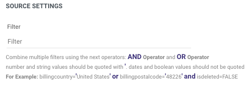 - Pull all the data without filters from Salesforce, and then filter it using the Logic in Data Integration. If you decide to use the filters in Salesforce, ensure that you maintain the syntax of the filters as supported by Salesforce.