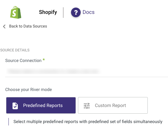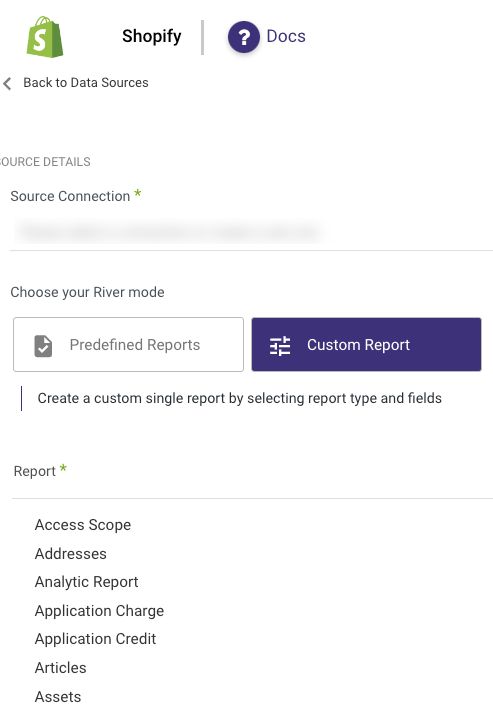 Create custom reports, and select a specific report to pull data from Shopify after establishing a connection.