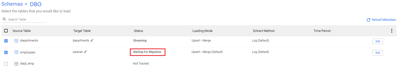 To align the data and the metadata in the first run, Data Integration makes a complete snapshot (or migration ) of the chosen table(s) using the Overwrite loading mode. After the migration ends successfully, Data Integration takes the existing binlog records and makes an Upsert-merge __ to the target table(s), continuing to fetch new records from the log as they are created.