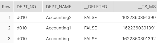 Each action performed on the log snapshot table is added to the table, along with information about when it was changed (recorded under the column __ts_ms) and if it was deleted (recorded under the column __deleted).