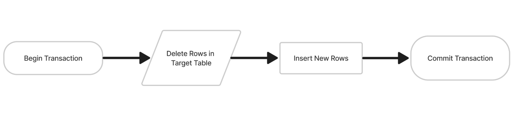 - Merge: Changes are applied to a temporary table before merging into the target, without replacing the table.