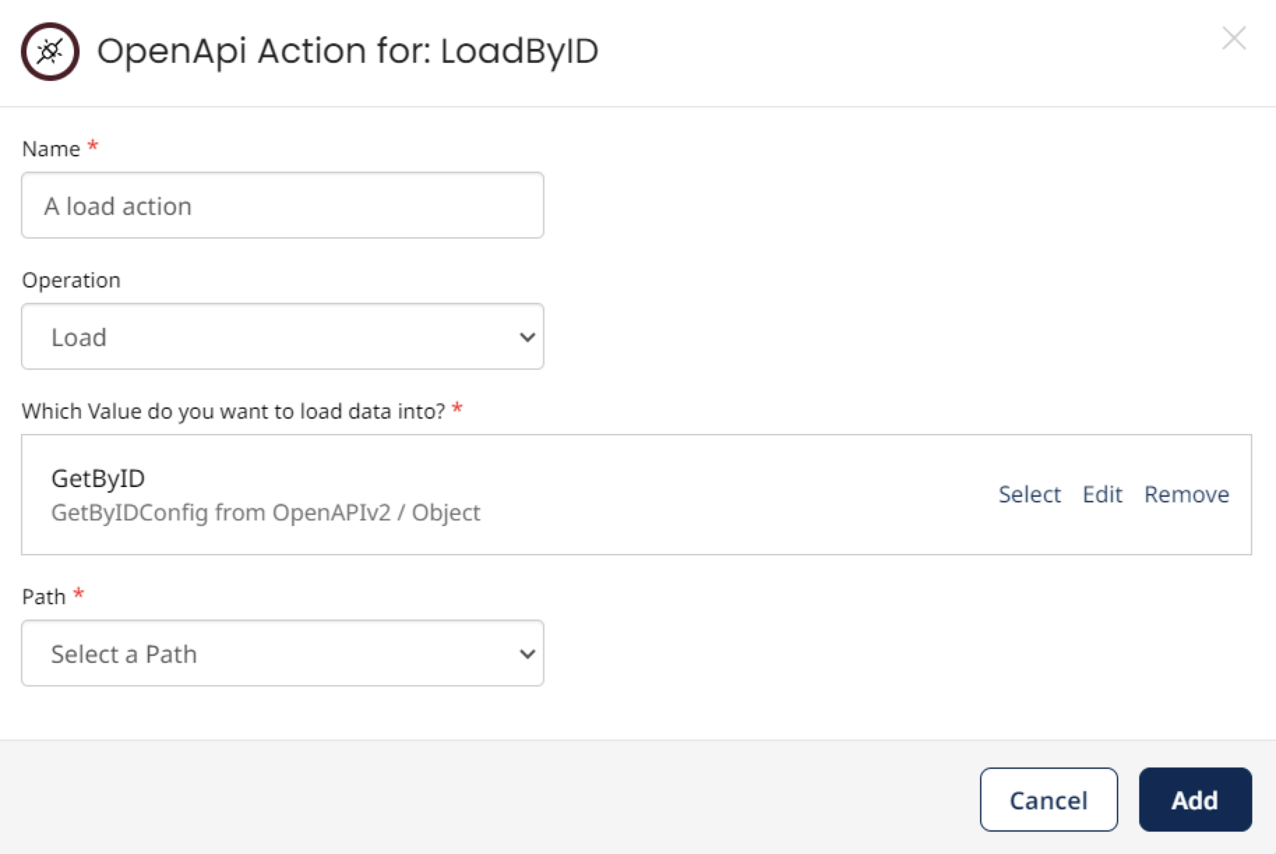 In the above example, we gave this action a name and chose an object of type GetByIDConfig, which was created by configuring the OpenAPI connector. Completing this step opens a new selection prompting you to select the path, which is the URL where the request is made. This is particularly useful for cases where a given object may be used in multiple requests. We can use the path option to choose the path that we intend to reach.