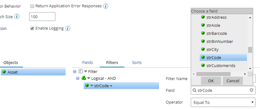 Query is an inbound action to search/retrieve records of specific CMMS object. The result returned depends on the fields selected in the Fields tab of the Query operation. The connector supports 3 types of search filters, which are listed in the sections below.