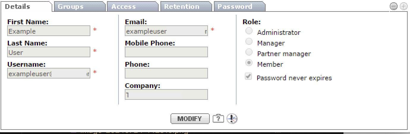 The Details tab provides user profile information such as name, email, role, and other user-specific attributes. Administrators can update this information as needed to keep user records up-to-date.