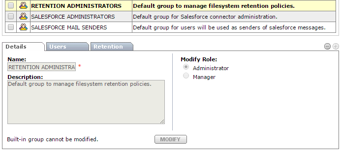 Only members of the Retention Administrators built-in group can make configuration changes.