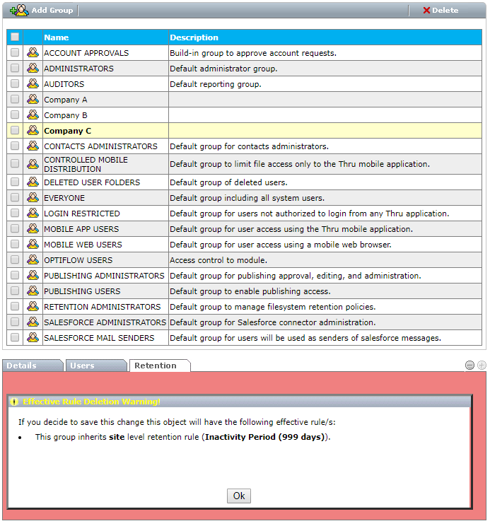 In the following screenshot, the system shows that the group is subject to a site-level rule:
