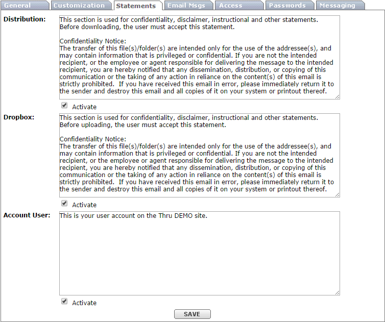 They must accept this statement before they log into the MFT site. - Make sure to turn on Activate to make this statement active.