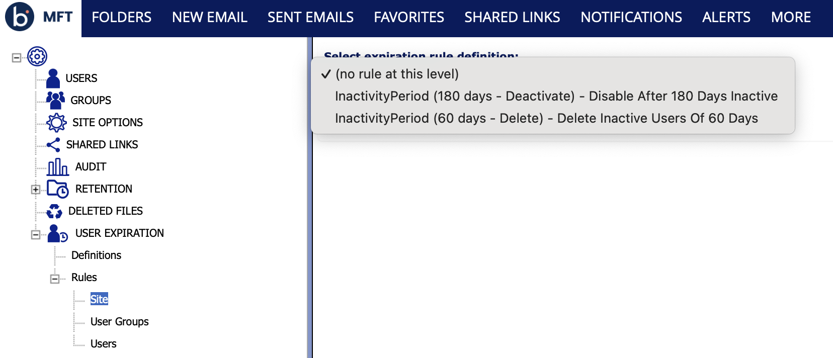 User rules are listed under Administration->User Expiration->Rules->Users, where administrators can view and manage them.